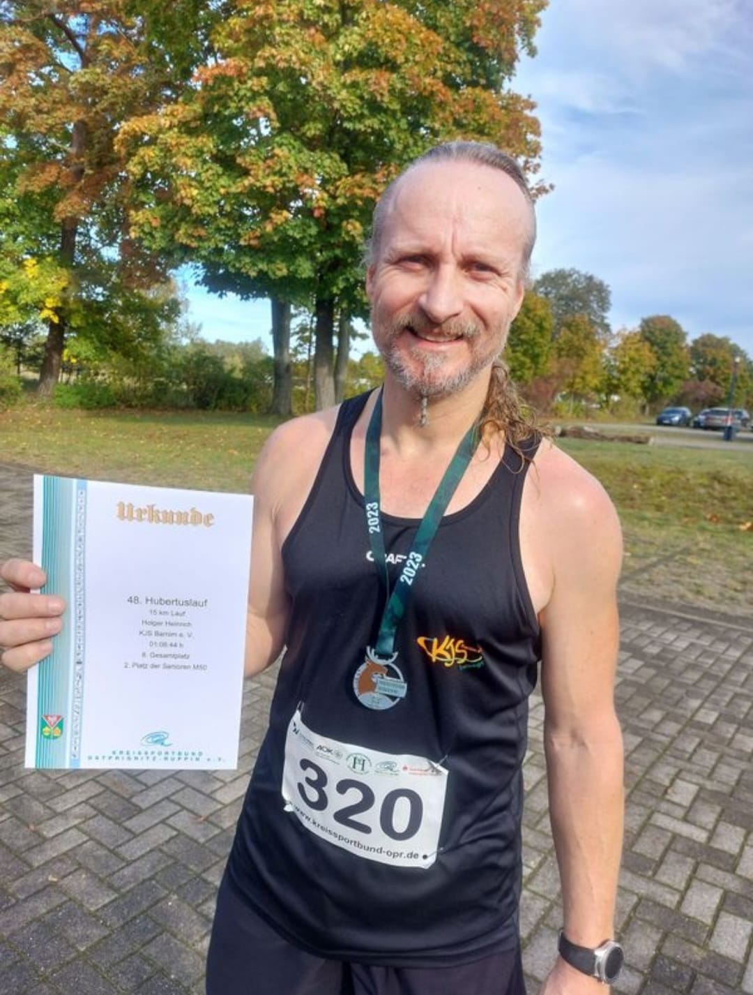 Am 22. Oktober 2023 starteten unsere Trainer Jana und Holger beim 48. Hubertuslauf in Neuruppin; Holger über den 15 km Lauf und Jana über 8 km Walking. Im Ziel konnten sich Holger in einer beachtlichen Zeit von 1:06:44 h über den 2. Platz bei den Senioren der M50 freuen und Jana in einer Zeit von 1:04:17 h über den 1. Platz der Seniorinnen W50.
