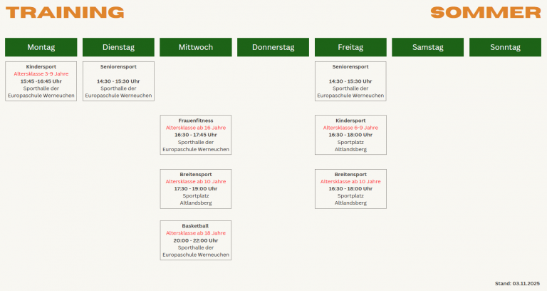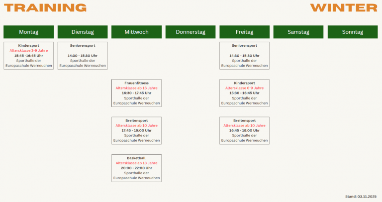Der Seniorensport findet in den Herbst- und Wintermonaten zweimal pro Woche jeweils in der Sporthalle der Europaschule statt.