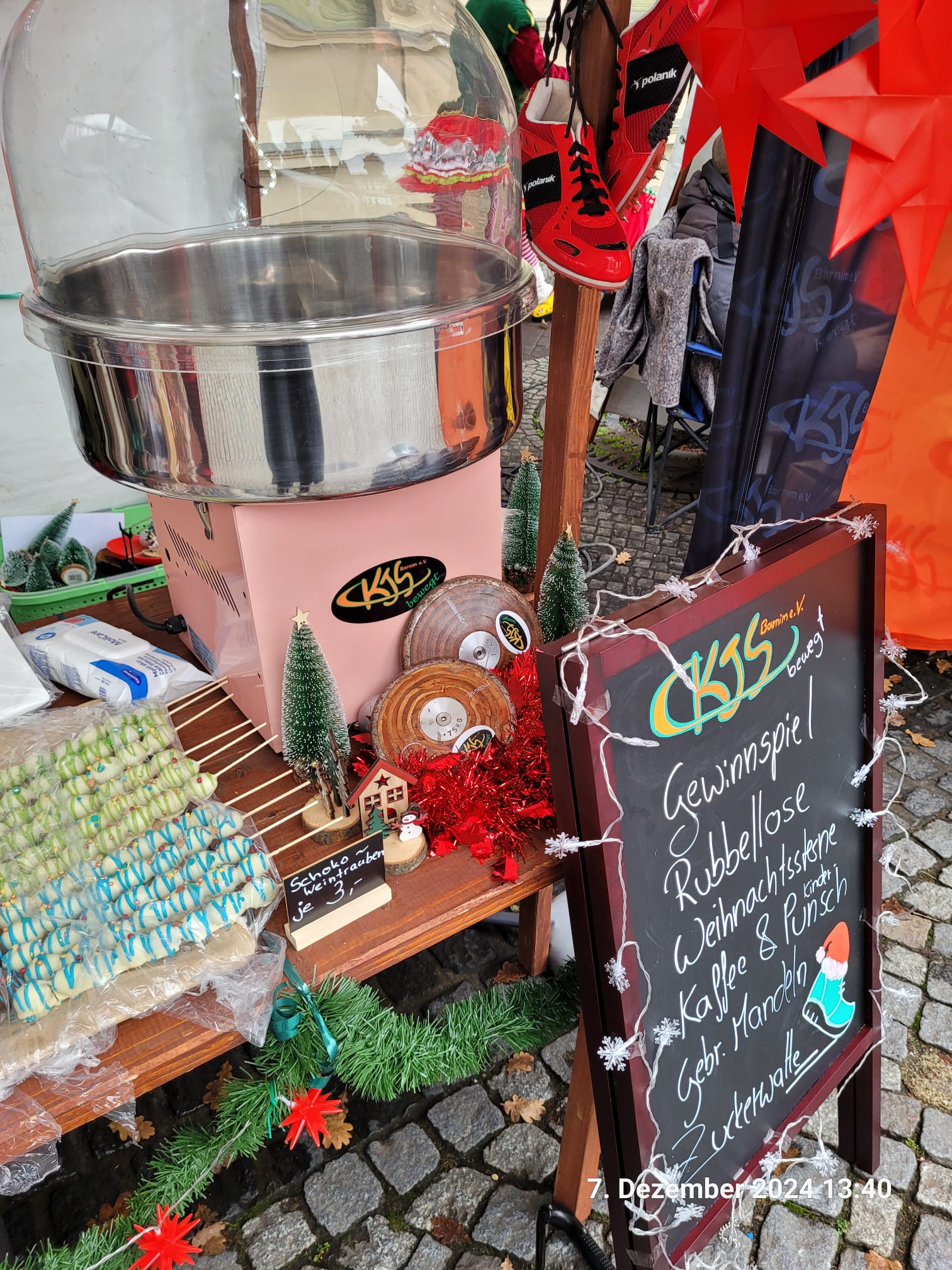 Am Weihnachtsstand vom KJS Barnim e. V. war für das leibliche Wohl bestens gesorgt: Mit köstlichen gebrannten Mandeln, schokolierten Weintrauben und frischer Zuckerwatte konnten wir sowohl Kinder als auch Erwachsene begeistern. Besonders der Kinder-Glühwein, fand bei den nass-kalten Temperaturen, großen Anklang und war schnell ausverkauft.